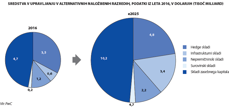 |V industriji investicijskih skladov se na globalni ravni dogajajo spremembe. Sredstva v upravljanju so narasla s 37.000 milijard dolarjev v letu 2004 na 85.000 milijard dolarjev v letu 2016. Glede na analizo revizijske hiše PWC bodo investicijski skladi do leta 2025 upravljali 145.000 milijard dolarjev (118.000 milijard evrov). Od tega bo več kot 15 % vseh sredstev oziroma več kot 21.000 milijard dolarjev v alternativnih naložbenih razredih.