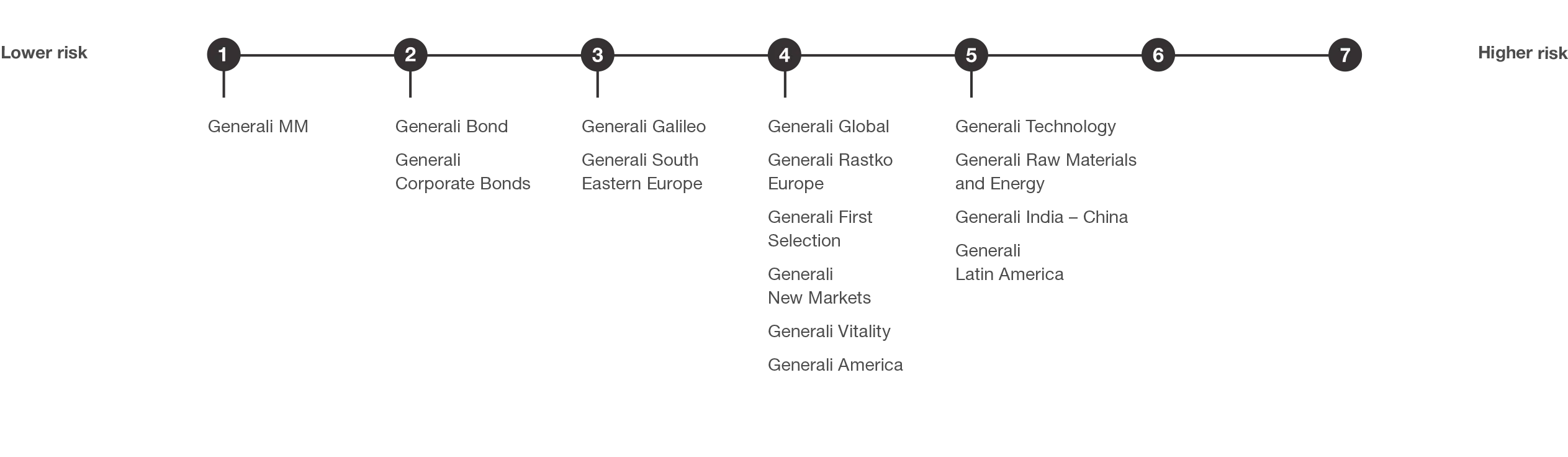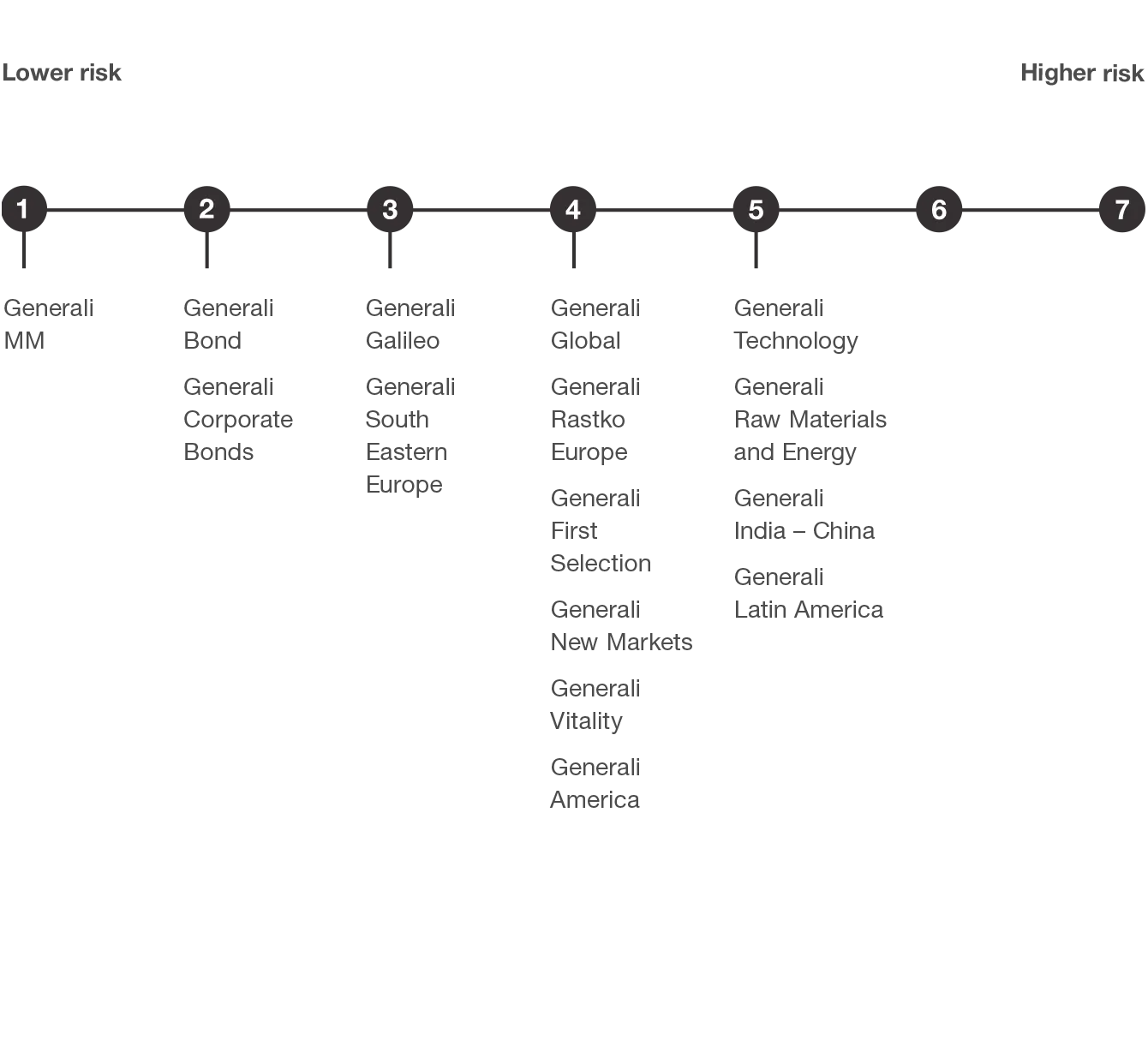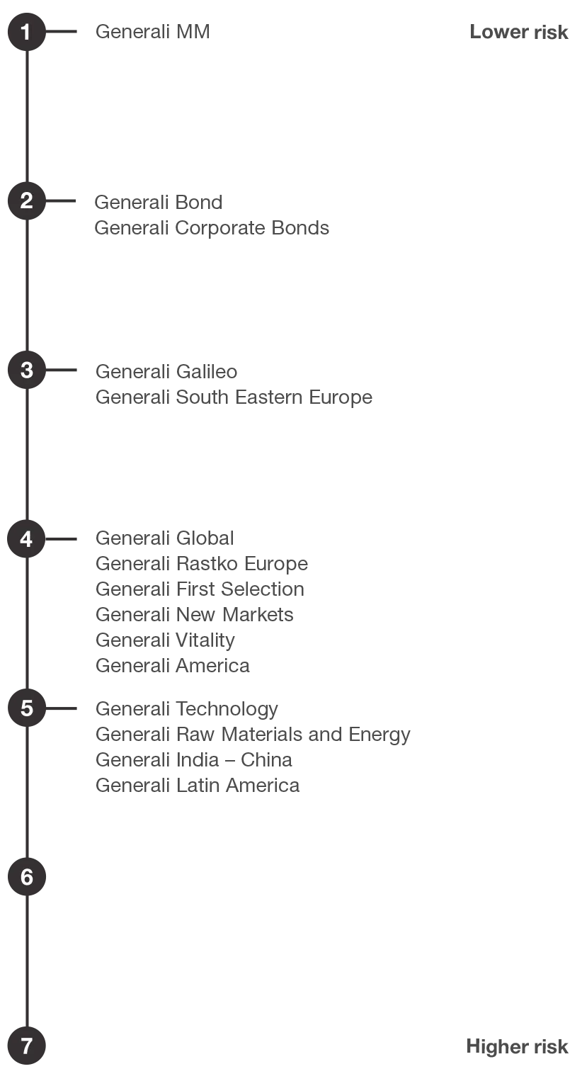 The risk indicator assumes you keep the fund for at least 5 years (Generali Galileo, Generali Rastko Europe, Generali First Selection, Generali South Eastern Europe, Generali New Markets, Generali Raw Materials and Energy, Generali Technology, Generali Vitality, Generali India – China, Generali Latin America, Generali Global, Generali America), 3 years (Generali Bond and Generali Corporate Bonds), or 30 days (Generali MM), respectively.