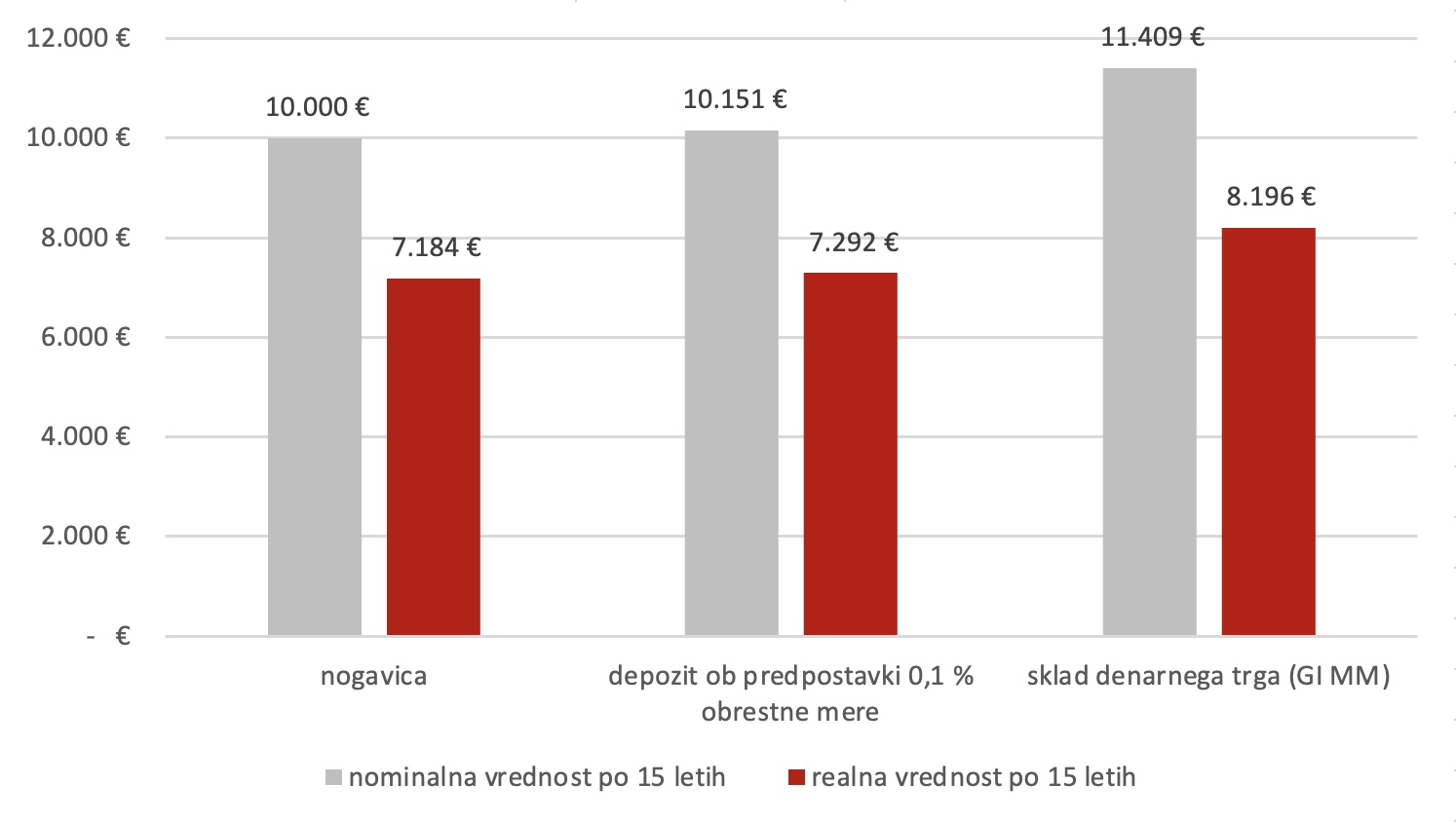 Skupna inflacija v Sloveniji v zadnjih 15 letih je znašala 39,2 %. To pomeni, da bi se realna vrednost vsote 10.000 evrov »v nogavici« v tem času znižala za 2816 evrov. Depozit z 0,1 % obrestno mero (približna višina obrestne mere, ki jo na dolgoročne depozite ponuja večina slovenskih bank), bi nanesel 151 evrov čistega donosa, tudi depozit torej ob predpostavki 0,1 % obrestne mere varčevalcu nudi zelo skromno varovanje pred inflacijo.