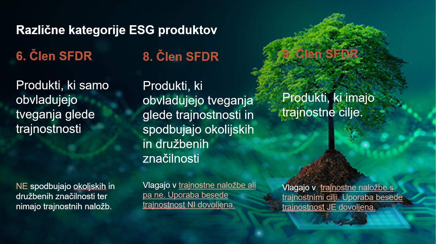 *Uredba SFDR (Uredbe (EU) 2019/2088 Evropskega parlamenta in Sveta z dne 27. novembra 2019 o razkritjih, povezanih s trajnostnostjo, v sektorju finančnih storitev, ki določa pravila o preglednosti vključevanja tveganj glede trajnostnosti in upoštevanja škodljivih vplivov v postopke pri udeležencih na finančnem trgu in finančnih svetovalcih ter pravila o zagotovaljanju informacij o trajnostnih vplivih finančnih produktov).