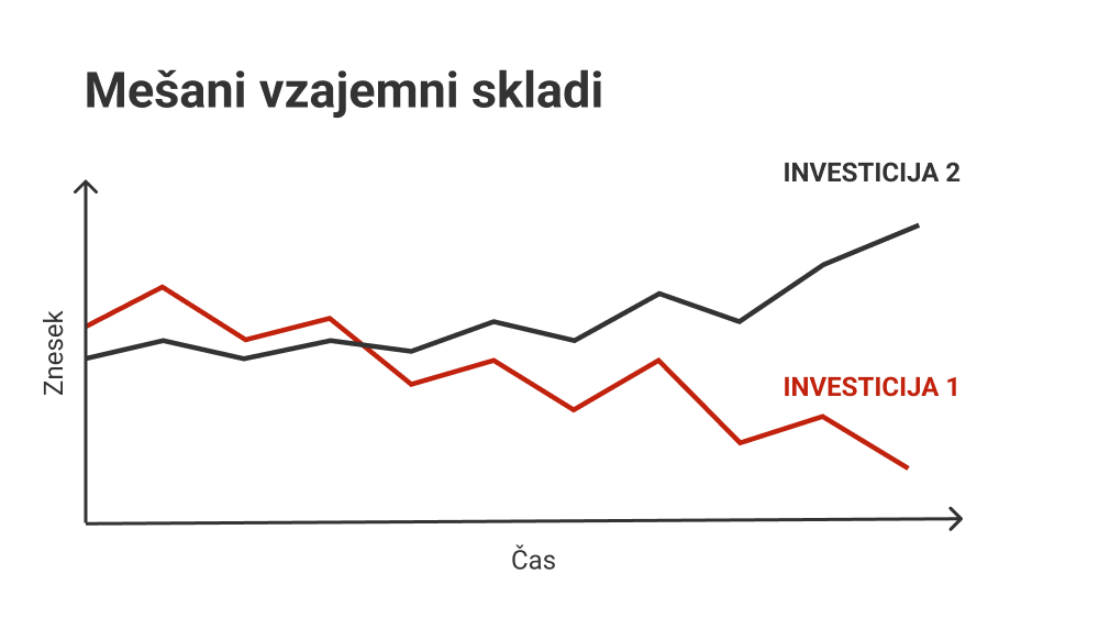 Mešani vzajemni skladi izkoristijo prednosti obeh zgoraj omenjenih vrst vzajemnih skladov in tako učinkovito objarujejo vaše investirane prihranke pred nihanjem na trgu. Vaši prihranki tako niso izpostavljeni samo enemu tipu naložb ( kot recimo delniški vzajemni skladi, ki so sicer donosni, a zelo odvisni od razmer na trgu), ampak so razdeljeni med delniške in obvezniške vzajemne sklade.