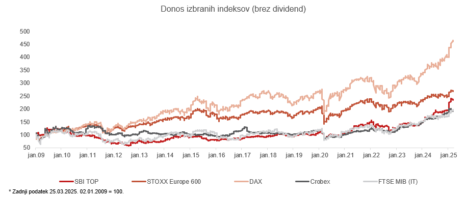 Po izjemno uspešnem lanskem letu ostaja indeks SBI TOP tudi letos še naprej med vodilnimi globalnimi indeksi (četrti na svetu, merjen v evrih brez dividend do 25. marca), kar nekatere postavlja pred vprašanje, ali je tolikšna rast upravičena. V medijih se že postavljajo vprašanja, ali smo priča novi evforiji, podobni tisti po vstopu v EU, ali gre samo za lovljenje priključka z drugimi evropskimi indeksi, ki so v preteklih letih dosegali rasti, o katerih smo v Ljubljani le sanjali. Nemški in francoski delniški indeksi so dosegli dno leta 2009, SBI TOP pa ga je dosegel skupaj z drugimi perifernimi indeksi v času evropske dolžniške krize (2012). Merjeno od začetka leta 2009 se je tako SBI TOP šele letos približal donosu vseevropskega STOXX Europe 600 z velikim prispevkom lanskega in letošnjega leta. Gledano z vidika vrednotenja, je po kazalniku P/E (cena na enoto dobička), osrednji slovenski delniški indeks še vedno dokaj ugodno vrednoten in kar precej zaostaja za bolj likvidnejšima nemškim in vseevropskim indeksom.