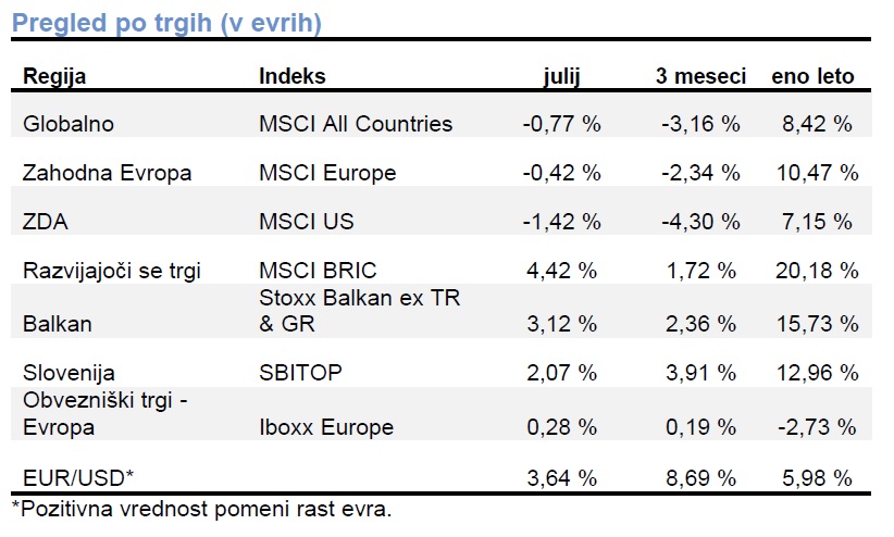 Globalni delniški trgi so se julija nekoliko pocenili. Pocenitev je prišla z razvitih trgov, saj so delnice v Evropi izgubile skoraj pol odstotka, delnice v ZDA pa še odstotek več. Vlagatelji so imeli pozitivne donose na investicijah v razvijajočih se trgih in trgih v regiji Balkan.