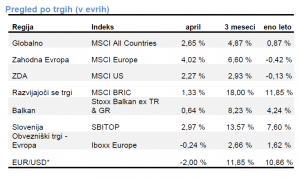 Globalni delniški trgi so se v aprilu podražili. Najvišjo rast so zabeležile evropske delnice, in sicer kar 4 %, medtem ko so trgi v razvoju pridobili le nekaj več kot odstotek. Kupci so prevladali tudi na domači borzi, ki se je podražila za skoraj 3 odstotke.