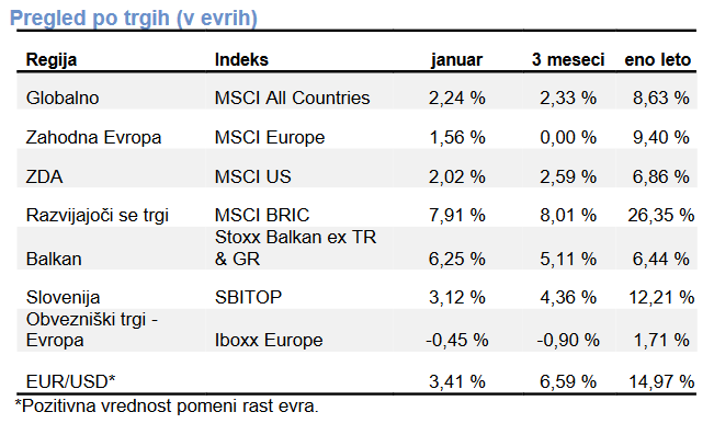 Globalni delniški trgi so se v prvem mesecu leta podražili. Indeks MSCI je zrastel za nekaj več kot dva odstotka, merjeno v evrih. Rast je bila najvišja na trgih v razvoju, ki so se podražili za skoraj osem odstotkov, merjeno z indeksom MSCI BRIK.