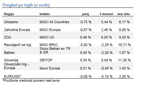 Globalni delniški trgi so se v juniju nekoliko pocenili. Med regijami so največji padec utrpele naložbe na trgih v razvoju, večjih sprememb ni bilo niti na slovenskem trgu niti na ostalih trgih v regiji. Pozitivne donose so vlagatelji zaslužili na obvezniških trgih.