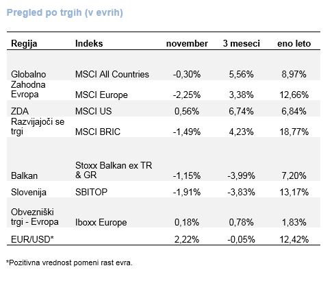 Globalni delniški indeks MSCI se v novembru ni občutneje spremenil. Trgi v Evropi so se pocenili za nekaj več kot 2 odstotka, medtem ko so naložbe v ZDA pridobile pol odstotka. Vsi donosi so izraženi v evrih.