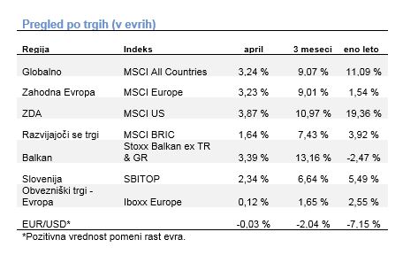 Rast na globalnih trgih od začetka leta se je nadaljevala tudi v aprilu. Delniški indeks MSCI je pridobil nekaj več kot 3 %. Trgi v Evropi in ZDA so se podražili za več kot 3 %, medtem, ko je bila rast tečajev delnic na trgih v razvoju nekoliko pod 2 %.