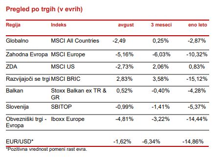 Na začetku avgusta se je poletno okrevanje na svetovnih borzah nadaljevalo. Optimizem med vlagatelji so krepile objave četrtletnih rezultatov podjetij na razvitih trgih in upad cen surove nafte. Največje delniške družbe so kljub visoki inflaciji in negotovim gospodarskim obetom v drugem četrtletju ohranile zelo solidne rezultate. Julijska inflacija v ZDA je prvič po dolgem času pokazala umirjanje. V drugem delu meseca je sledila hladna prha. Glavni delniški indeksi so ob zaostrenih tonih centralnih bankirjev, vse slabši gospodarski sliki in geopolitičnih trenjih izgubljali, globalni indeks je avgust zaključil 2,49 % nižje. Na splošno je bil avgust na borzah aktivnejši kot smo bili na vrhuncu poletja vajeni v preteklih letih in nihajnost je bila posledično velika. Med panogami znotraj delniškega trga so največ izgubile delnice podjetij, ki so bolj občutljive na višje obrestne mere in ohlajanje gospodarstva.
