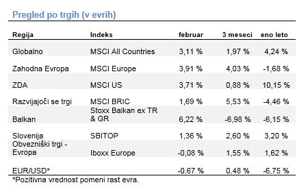 Globalni delniški trgi so v februarju nadaljevali z rastjo. Delniški trgi so se tako v Evropi kot tudi v ZDA podražili za skoraj 4 %, merjeno z indeksi MSCI, izraženimi v evrih. Trgi v razvoju so z rastjo tokrat nekoliko zaostajali.