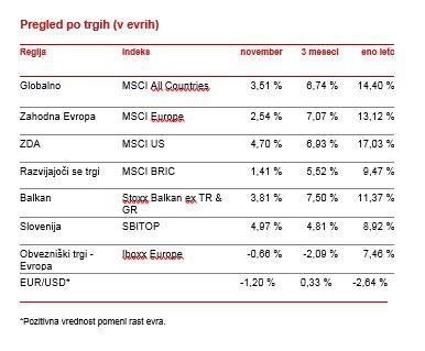 V novembru so se globalni delniški trgi podražili za približno 3,5 odstotke, merjeno z indeksom MSCI, izraženim v evrih. Rast tečajev v ZDA je bila višja od rasti v Evropi. Trgi v razvoju so zaostajali.