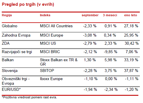 Globalni delniški trgi so v septembru beležili negativno rast. Vzroki so bile težave kitajskega nepremičninskega podjetja Evergrande, objave visoke inflacije, povišane zahtevane donosnosti državnih obveznic, napovedi zmanjševanja odkupa državnih obveznic v ZDA (t.i. »tapering«) in s tem napovedani dvig obrestnih mer v začetku leta 2022.