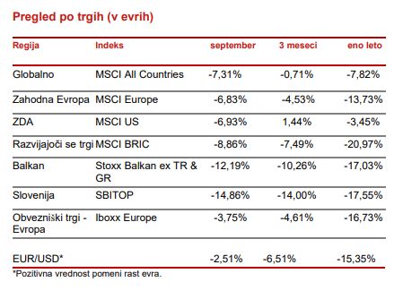 Če smo na delniških trgih visoke nihajnosti že dolgo vajeni, je bilo bolj neobičajno nedavno dogajanje na trgu obveznic. Po dolgih letih nenavadno visokih vrednotenj, ki so jih z ekstremno stimulativno denarno politiko povzročile centralne banke, je agresivno višanje obrestnih mer povzročilo strmoglavljenje cen obveznic oziroma strmo rast zahtevanih donosnosti. Zahtevana donosnost ameriške 10-letne državne obveznice je konec meseca znašala dobrih 3,80 %, podobne nemške pa 2,10 %. Močno raste tudi strošek odplačevanja slovenskega dolga, saj so vlagatelji v 10-letno državno obveznico konec septembra zahtevali že 3,3 % donosa – še pred enim letom pa 0,20 %. Burno je bilo na valutnih trgih. Ameriški dolar je tekom meseca močno pridobival, v zadnjih dneh pa so ostale večje valute nadoknadile precejšen del mesečnih izgub. Svetla točka je pocenitev nafte na svetovnem trgu, a ta cenitev gre predvsem na račun vračunavanja manjše porabe zaradi pričakovane recesije.