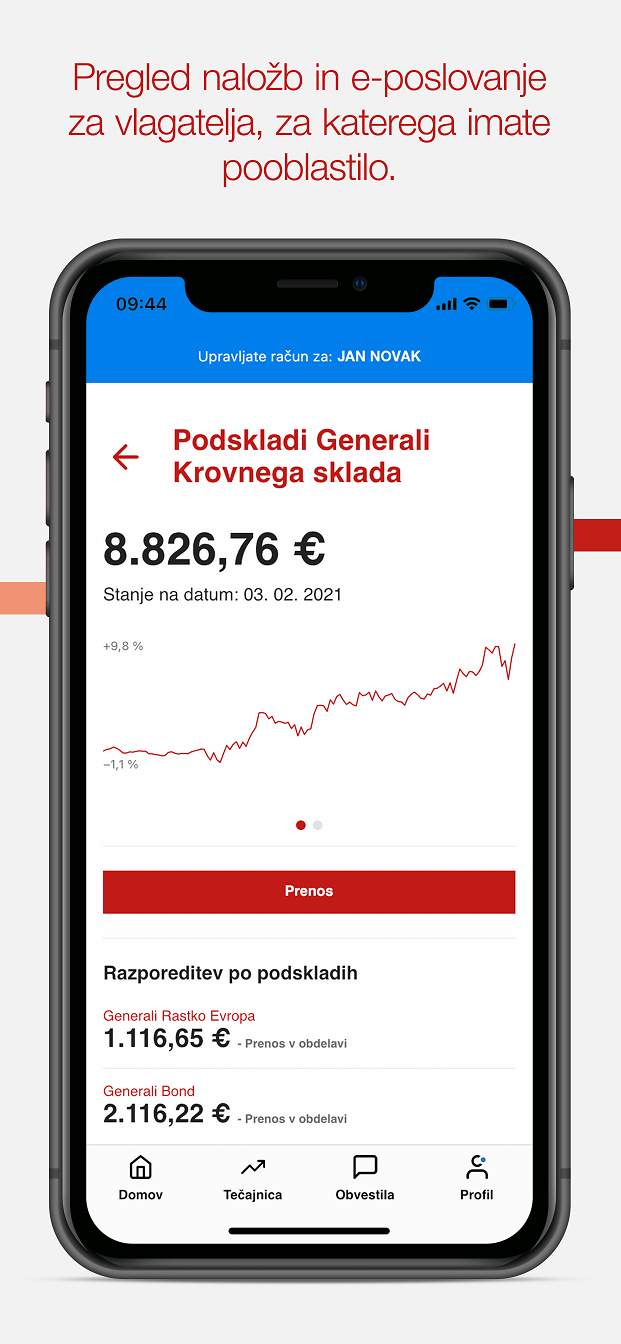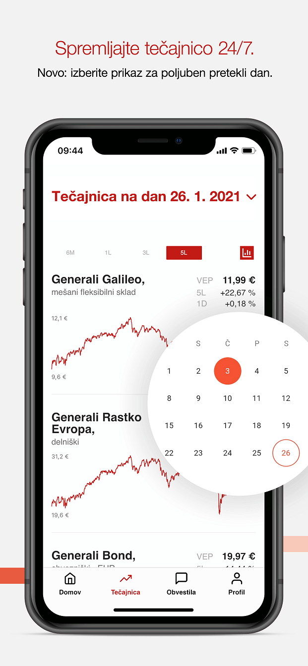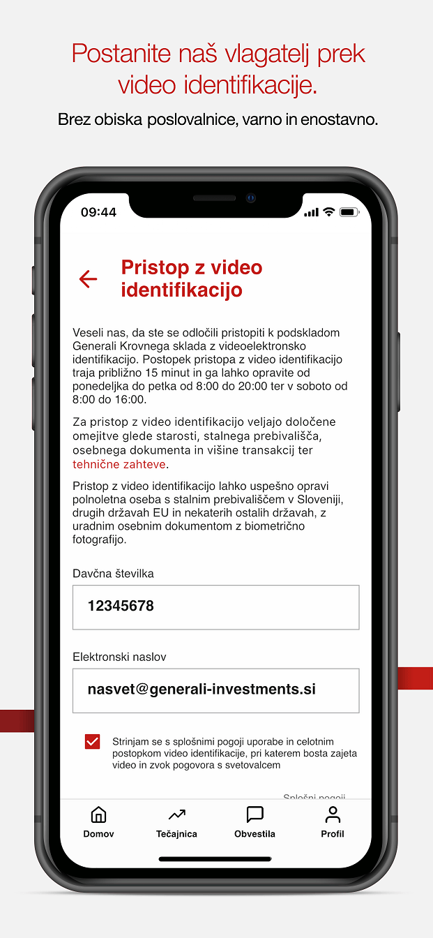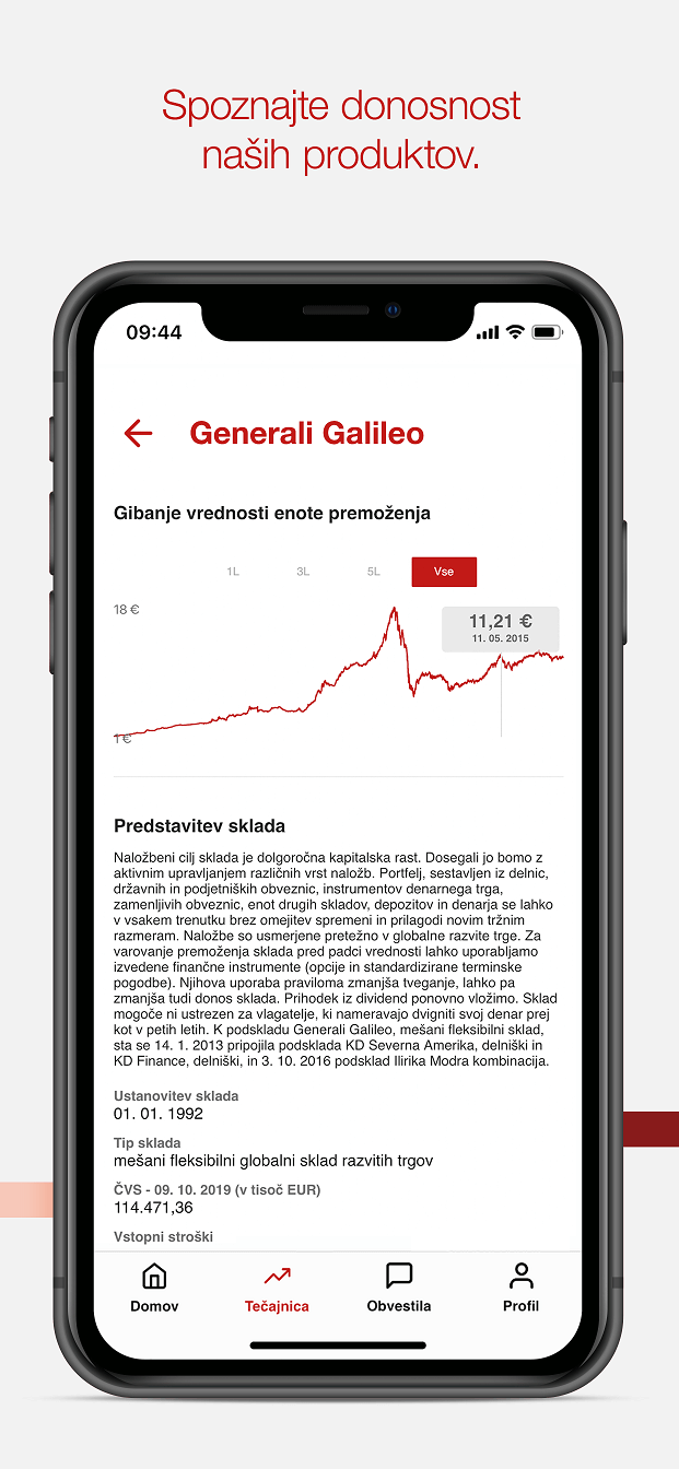 Brezplačna aplikacija Generali Investments vsem, tudi nevlagateljem, omogoča spremljanje tečajnice, gibanja podskladov Generali Krovnega sklada in donosnosti varčevalnih načrtov ter prebiranje najnovejših obvestil. Prek aplikacije lahko hitro in enostavne poiščete vam najbližjo poslovalnico. V najnovejši verziji smo vsem, ki še niste naši vlagatelji, omogočili pristop k podskladom Generali Krovnega sklada z video identifikacijo – brez obiska poslovalnice, varno in enostavno.