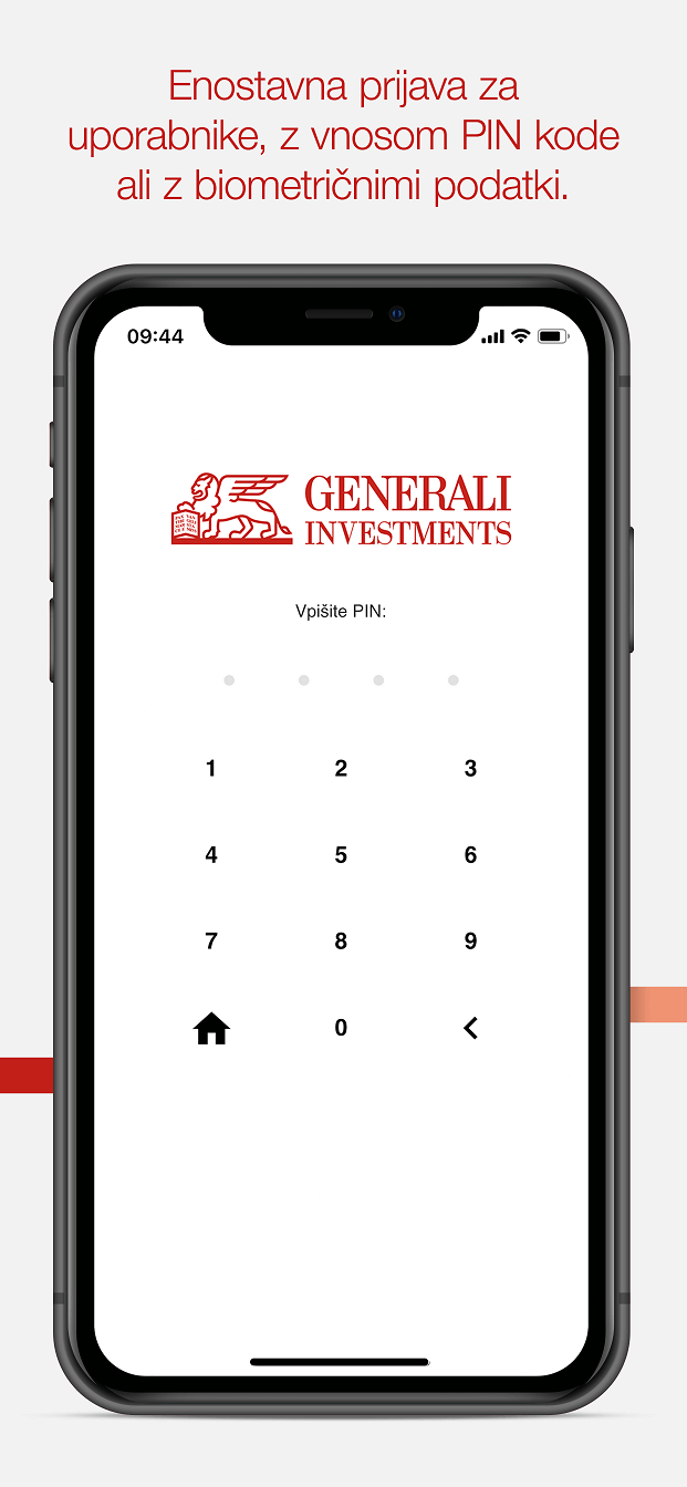 V mobilno aplikacijo se lahko vlagatelji Generali Investments (fizične osebe) prijavite s prijavni podatki naše spletne poslovalnice ali pa prek registracijskega postopka ustvarite uporabniški profil. Vstop lahko zaščitite s PIN kodo ali uporabo biometričnih podatkov.