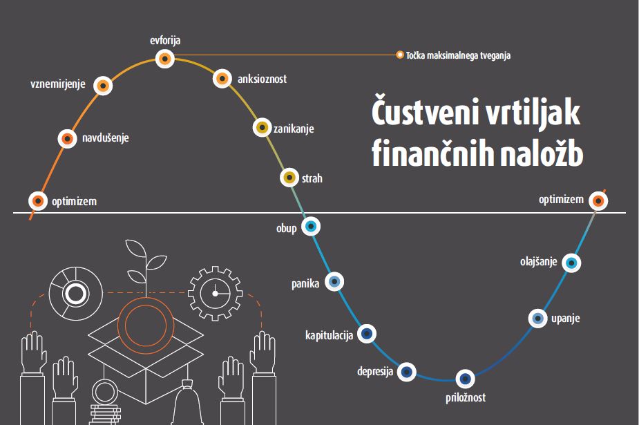 Stalnica kapitalskih trgov je nihanje in posledično tveganje. Vlagatelji pa nismo samo racionalna, ampak tudi čustvena bitja. S finančnimi vzponi se prebujajo pri nas čustva optimizma, navdušenja, vznemirjenja in evforije, ki rastejo, kot raste cikel. V trenutku obrata pa pridejo tesnoba, dvom, zanikanje, da gre kaj narobe, strah, da je čas za izstop že mimo, obup, ko je res že mimo, panika in žalost, pa še malo dvoma … in ko se padci umirijo in začne rasti nov cikel, nas čakajo upanje, olajšanje in z novim ciklom ponoven optimizem.