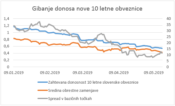 Zanimiv primer je Slovenija, ki je skoraj evforično pohitela z izdajo nove desetletne obveznice na začetku leta in bo v prihodnjih letih za izposojen denar plačevala dobrih 1,15 odstotka na leto. Novice iz prvega odstavka pa so vplivale na za polovico manjše zahtevane donosnosti. V primeru nove zadolžitve bi za izposojen denar danes plačevala samo še okoli 0,55 odstotka na leto. Omenjeno bi ob prodaji danes pomenilo 6,4-odstotni donos. Seveda pa ne moremo vsega pripisati makro stanju trga. Približno tretjino znižanja donosa bi pripisali tudi izboljšanju dojemanja izdajatelja Slovenije na finančnih trgih, saj se je pribitek na obrestno zamenjavo znižal s 34 bazičnih točk na dobrih 11.