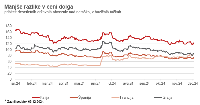 Na negativno razpoloženje vplivajo tudi skrbi glede morebitnih novih carin, ki jih napoveduje prihajajoči ameriški predsednik Donald Trump. Težave se širijo tudi v storitveni sektor, kar poleg nadaljevanja disinflacije v območju z evrom na široko odpira vrata nadaljnjim rezom ključnih obrestnih mer ECB. Trenutno vlagatelji tako v prihodnjih 12 mesecih pričakujejo za več kot 150 bazičnih točk rezov.