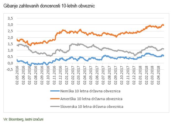 Dobro stanje gospodarstva pa je tudi vzrok za zaključek zelo sproščene monetarne politike v centralnih bankah, kar je lahko uvod v stabilizacijo gospodarstev ali pa vzrok za prehitro ohlajanje. V ZDA je donosnost desetletne ameriške državne obveznice aprila dosegla pomembno psihološko mejo tri odstotke. Pričakujemo, da bo Fed letos še dvakrat zvišal referenčno obrestno mero in tako poskušal preprečiti pregrevanje ameriškega gospodarstva.
