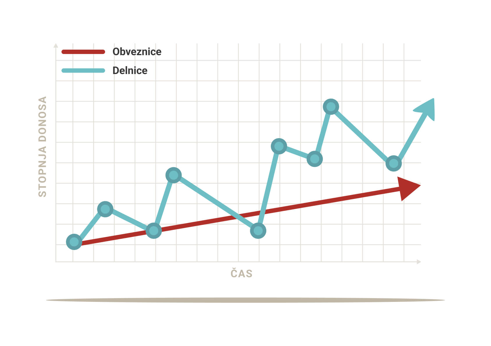 Graf prikazuje tipično gibanje naložbe v delniški in obvezniški trg. Medtem, ko je donosnost delniškega trga na dolgi rok višja, je rast obveznic bolj stabilna. Vloga obveznic v portfelju vlagatelja je zato predvsem zmanjšanje nihajnosti celotnega portfelja, prav tako služijo kot varovalka v primeru gospodarskih pretresov. Če je v praksi povprečna rast na razvitih delniških trgih med 7 % in 9 %, je dolgoročna povprečna donosnost najbolj spremljanih referenčnih srednje ročnih državnih obveznic med 2 % in 5 %. O tem, kako izkoristiti prednosti obveznic in jih optimalno vključiti v svoj naložbeni portfelj, se posvetujte s finančnimi svetovalci.